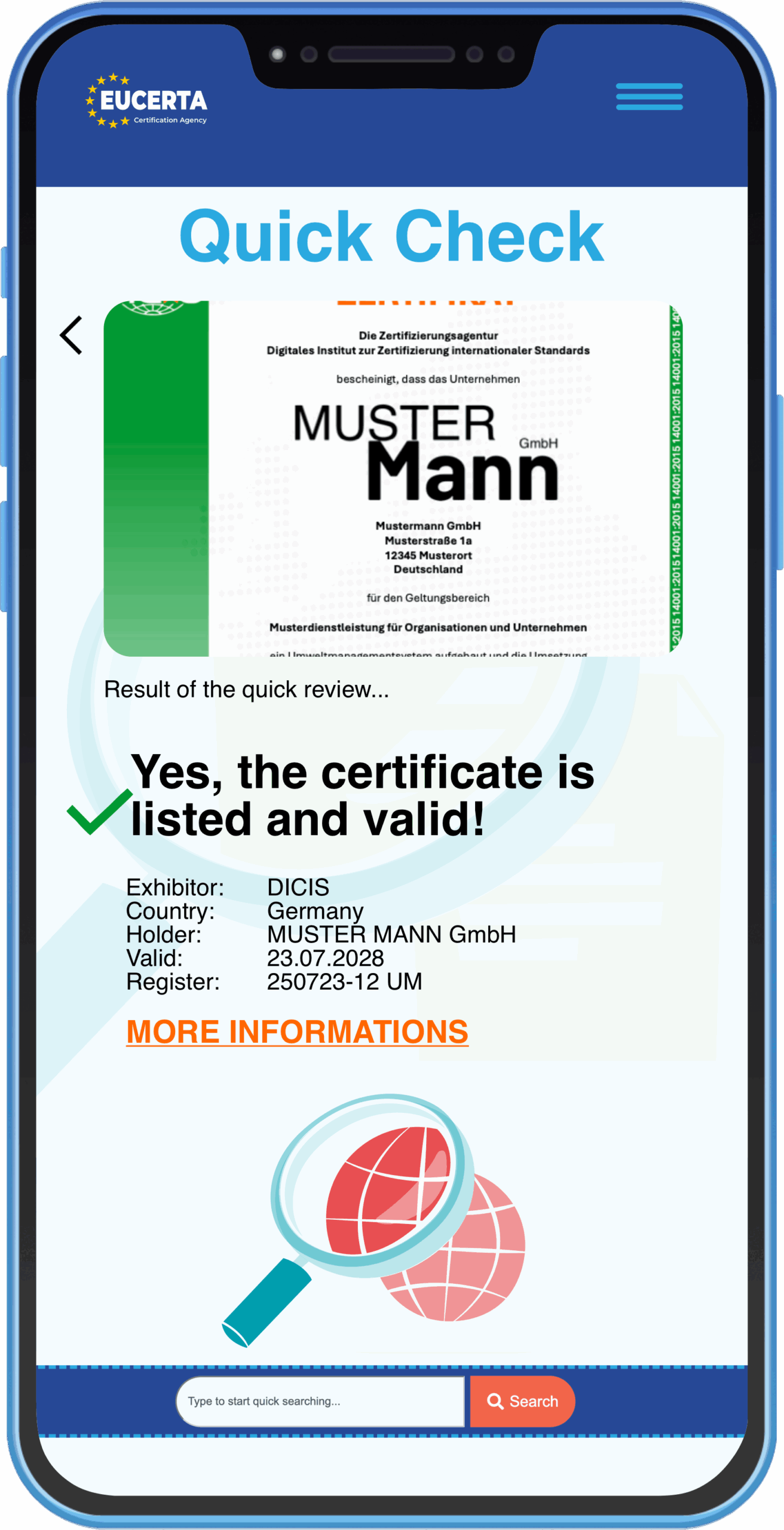 If you need to be quick, just start our web search. This searches the databases of our customers. You can also upload your certificates...